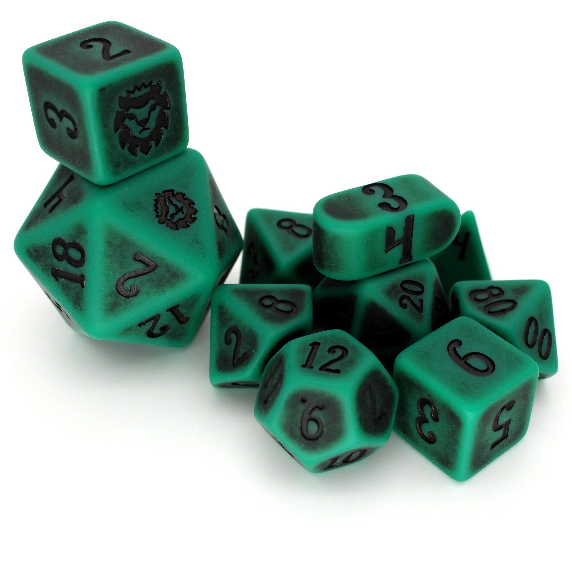 Naga Hide is a 10-piece set of brilliant green resin dice with matte finish and a darkened center pattern, inked in black.